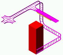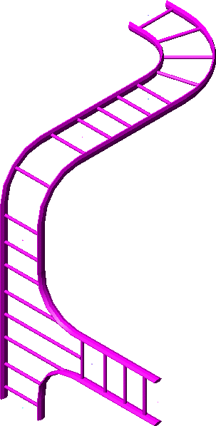 For å lage eksemplet vist over er det benyttet kabelstige. Velg det og sett den inn på nodepunktet. Neste et vertikalbøy. Da snur du UCS om X 90°, og UCS om Y 90°. Hent en T-avgrening og sett inn på nodepunktet. Deretter en halvmeter stige.